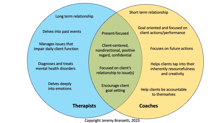 The single biggest difference is that therapists diagnose and treat mental health conditions, something far outside the purview of any form of coaching. This often involves a focus on past events that have led the person to have this mental health issue, with the hope that doing so helps the client achieve insight into the issue and improve their current functioning. By extension, therapists require different training and certification, and these are very different from coaching training. In fact, it’s important to note that while many forms of coaching training exists, there is no actual licensing or government oversight of the coaching industry. So, as a potential customer, do your homework to see if/how a potential coach is qualified for the service they offer you.
